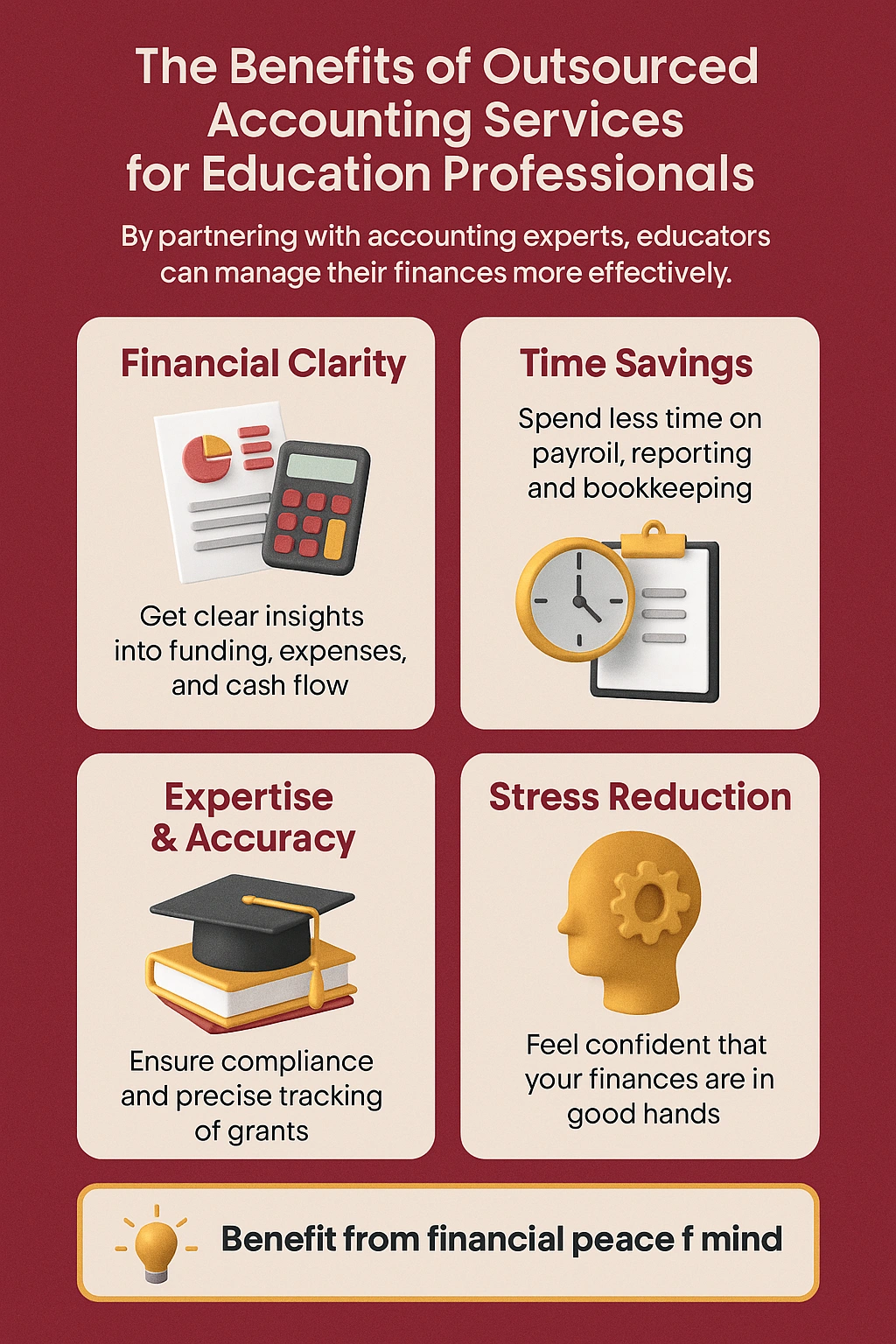 The real benefit is freedom. When financial tasks are handled by professionals, education professionals can redirect their energy toward their core mission—teaching, mentoring, and supporting students. Outsourced accounting not only provides peace of mind, but also gives schools, consultants, and individual educators the clarity to plan ahead, invest wisely, and grow with confidence.